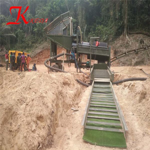 Potable gold mining trommel wash plant are mainly used for gold dust recovery. It is composed by feeder hopper, scrubbing canister, nonaxle trommel, chute, shaking chute, centrifugal machine, etc. The mobile trommel screen is a optimized removable platform for gold recovery, applicable to small or medium scale of placer gold ore processing that need mobile operation. The gold dust ore processing capacity is 40 to 500 tons per hour.